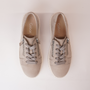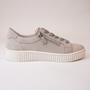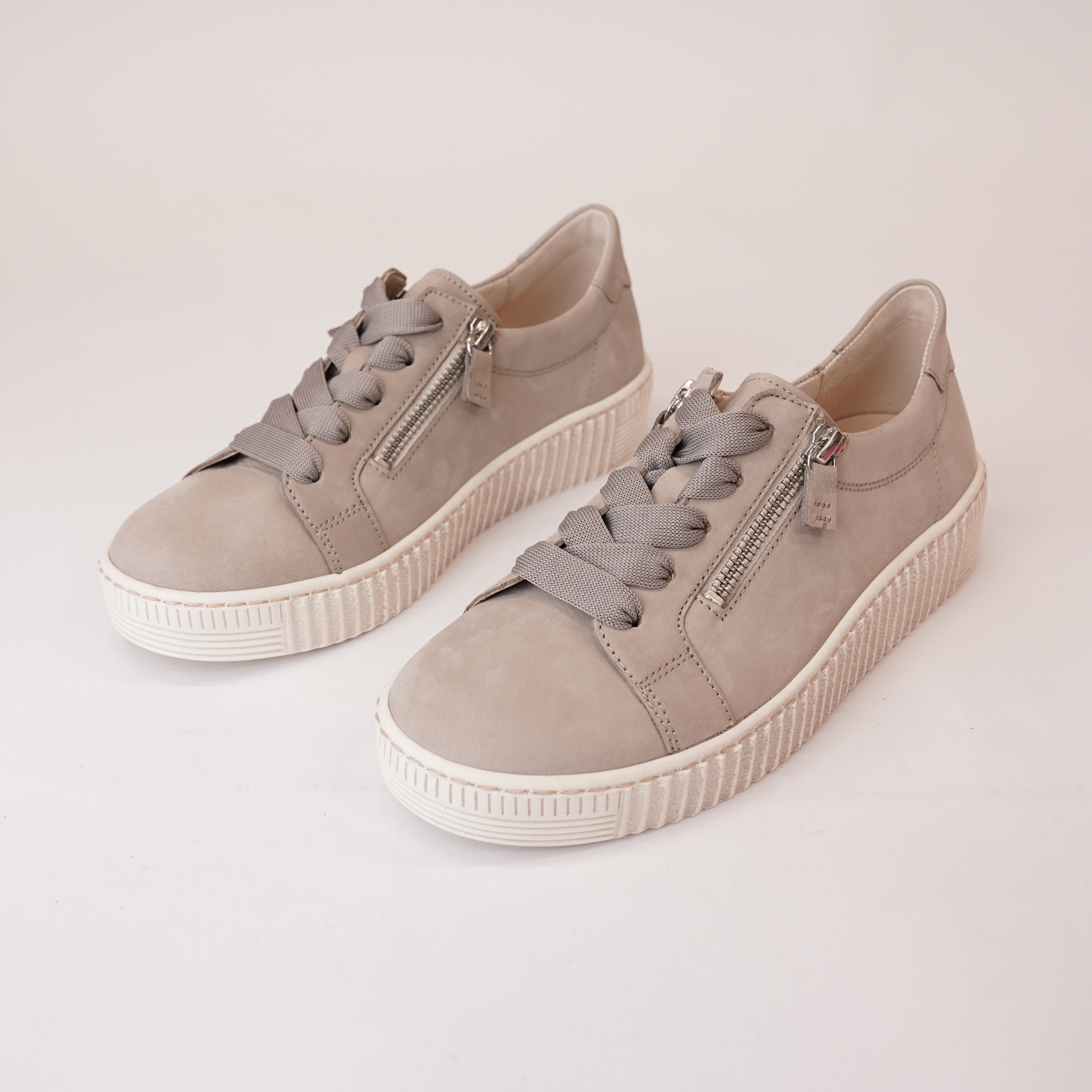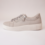 The Amelia Linen Nubuck Leather Sneakers by Gabor combine casual style and comfort. Crafted from neutral-toned leather, they feature wide ribbon laces and a side zipper for easy wear. With a cushioned sole for all-day comfort, these sneakers are perfect for daily wear, offering both functionality and flair. A must-have for any wardrobe.