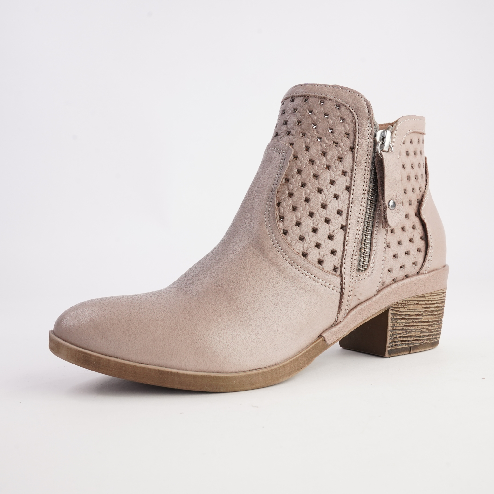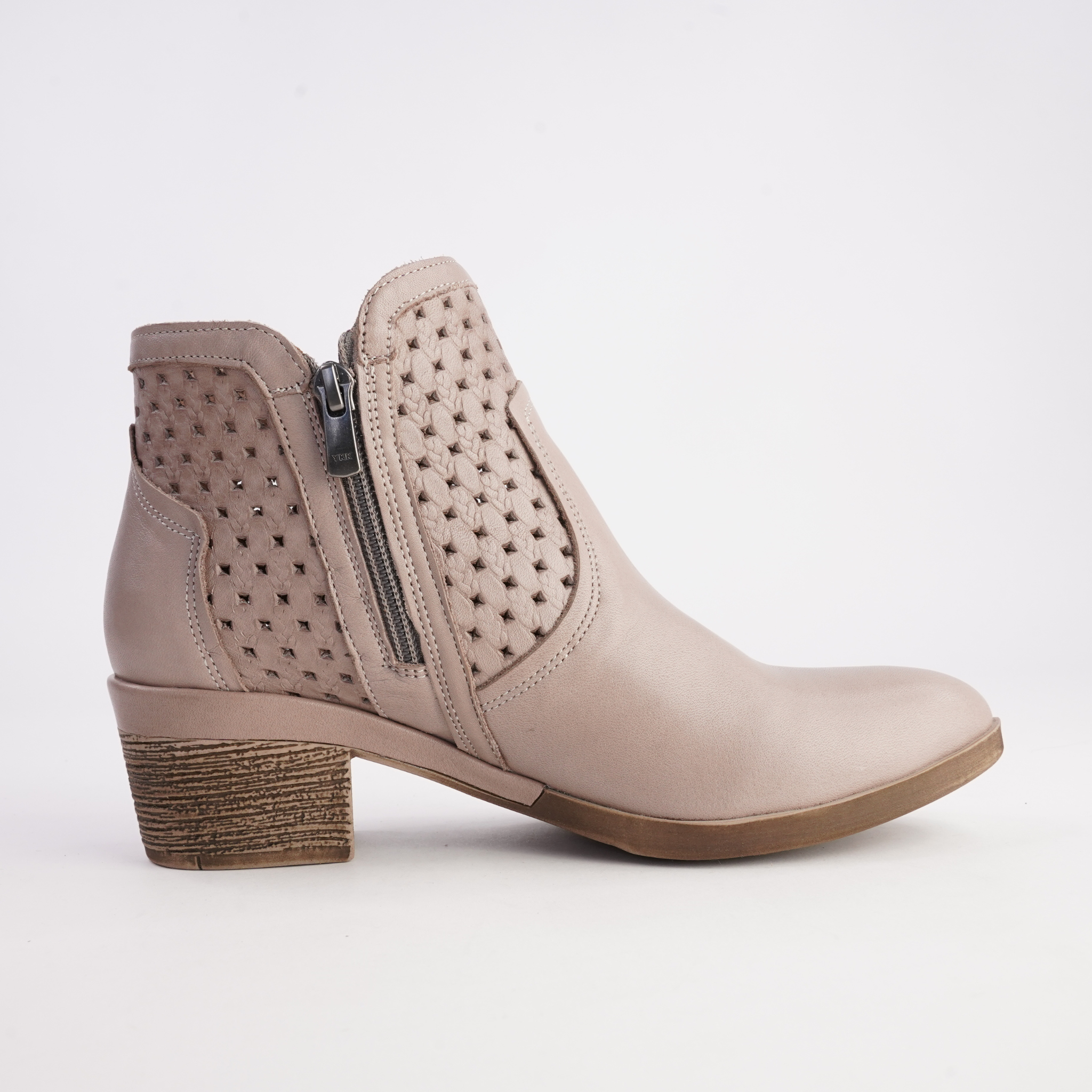 Effortlessly versatile, the Barlow Taupe Leather Ankle Boots by Cabello blend everyday comfort with refined detailing. Crafted from soft black leather, this flattering ankle silhouette features woven and perforated side panels for subtle texture and breathability. A functional side zip allows for easy on and off, while the stacked-look block heel adds just the right amount of height. Designed for all-day wear, Barlow is the perfect balance of comfort and polished style.
