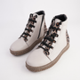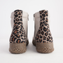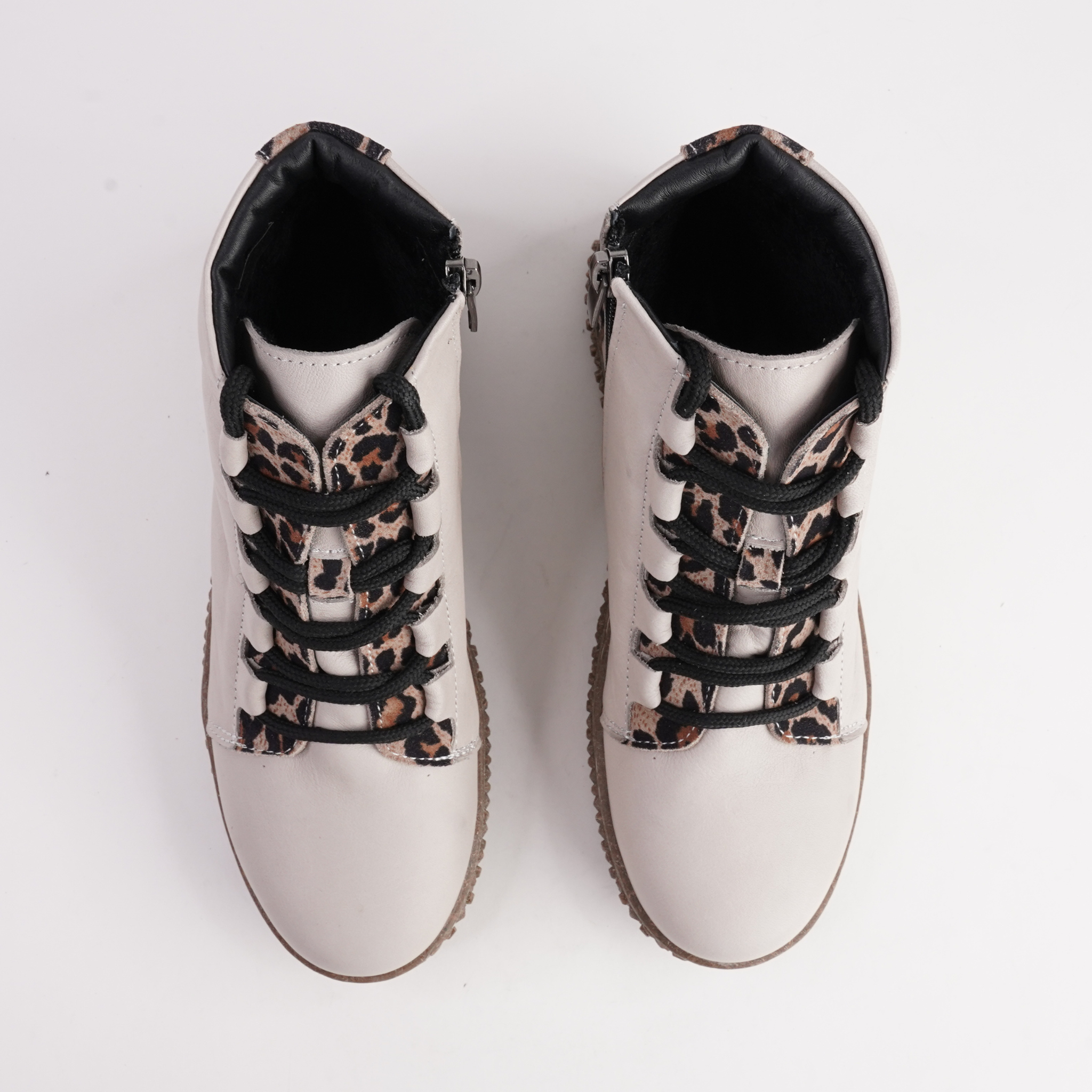 The Bonnie ankle boots by Cabello combine everyday comfort with a touch of statement style. Crafted from soft taupe leather with leopard print accents, this lace-up design offers a secure fit while the side zip allows for easy on-and-off wear. A flexible textured sole provides grip and cushioning for all-day comfort.