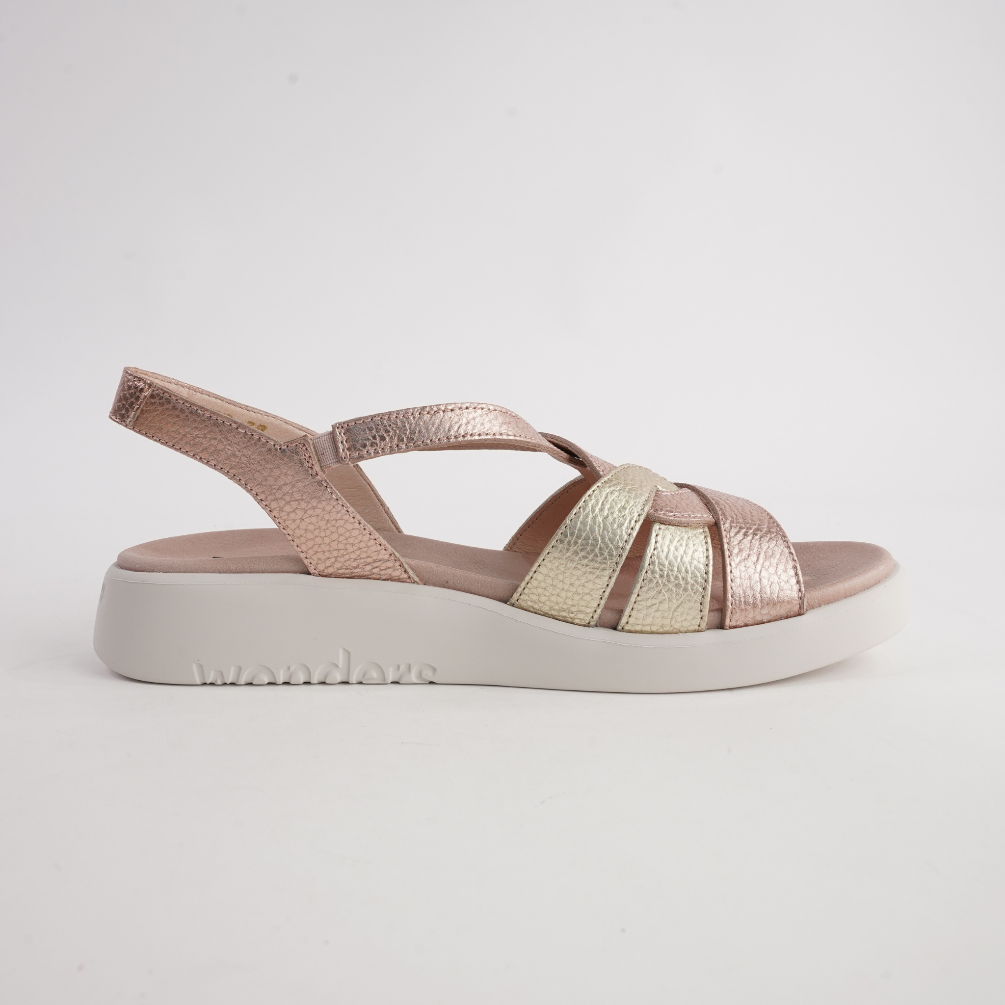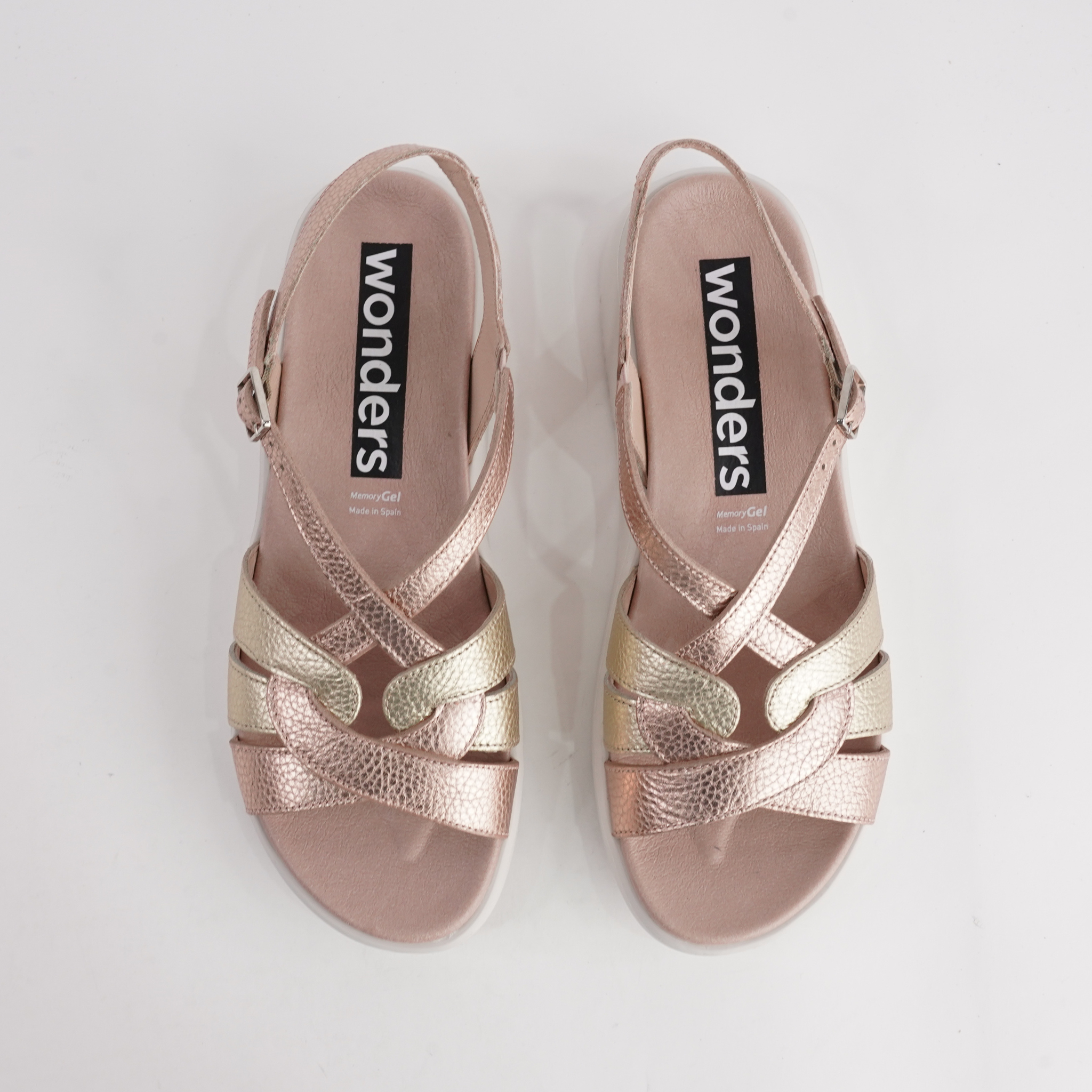 The Cassidy Rose Metallic Multi Leather Sandals by Wonders offer a perfect blend of modern edge and everyday comfort. Made in Spain from premium leather with metallic rose and gold accents, these sandals feature a sleek multi-strap design and adjustable buckle fastening. The ultra-light WondersFly™ sole delivers cushioned support, making them ideal for day-to-night wear.