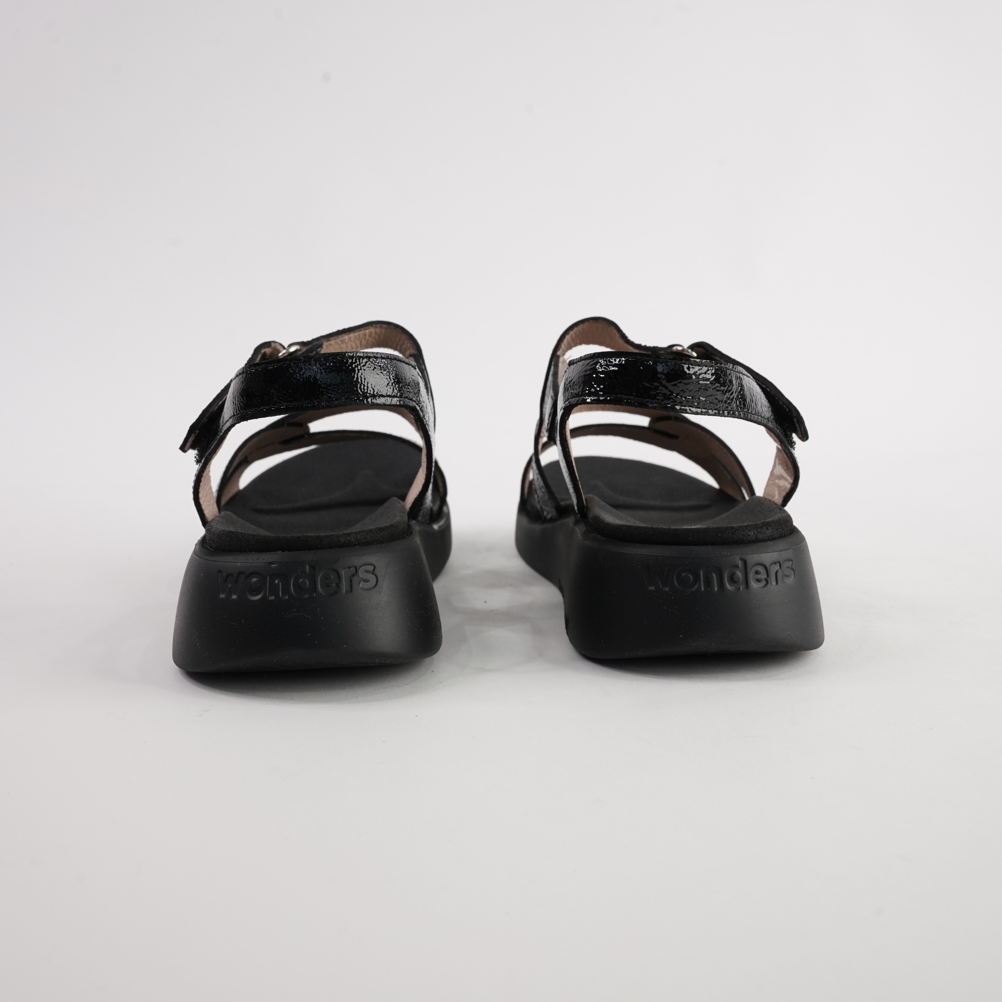 The Chantal Black Patent/Black Sole Leather Sandals by Wonders combine timeless sophistication with all-day comfort. Crafted in Spain from premium patent leather, these sandals feature a contemporary crossover strap design and a soft leather lining. The ultra-light WondersFly™ sole ensures a cushioned, flexible step — perfect for day-to-night wear.
