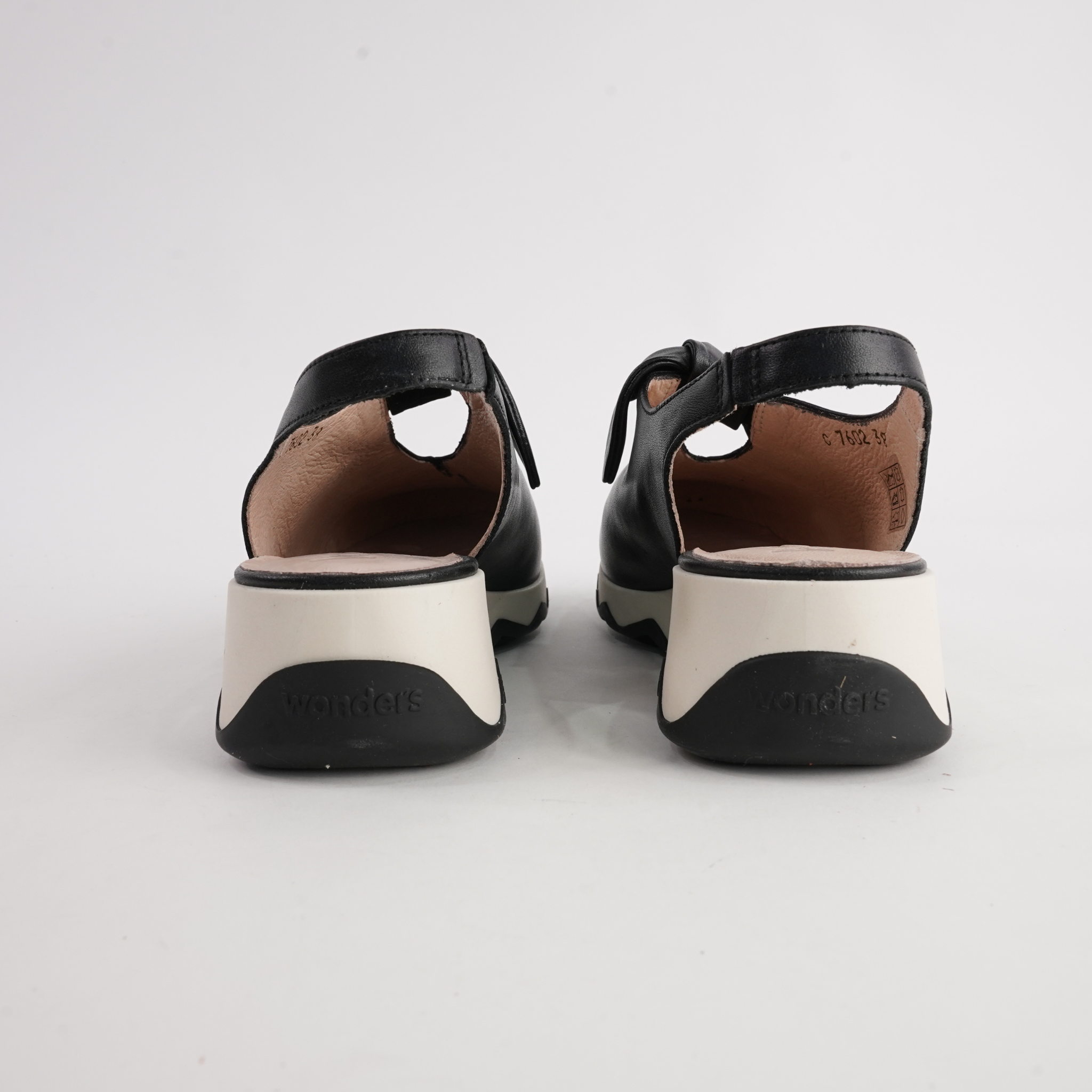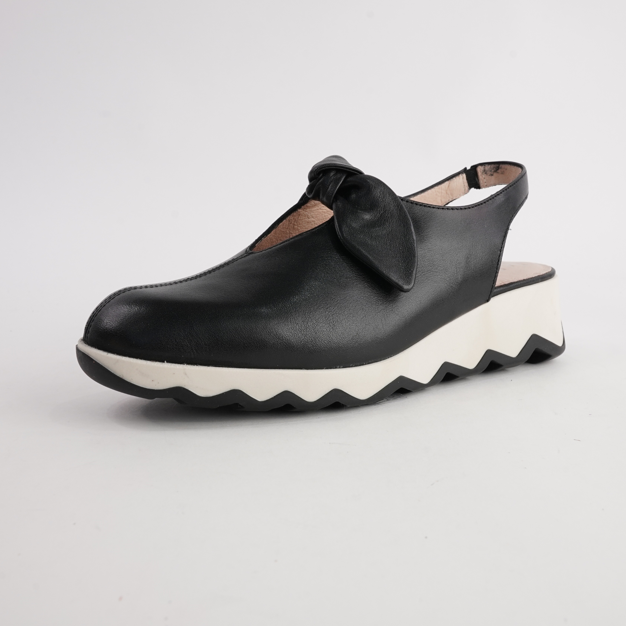 The Claudia Black Leather Wedges by Wonders offer a perfect blend of contemporary design and comfort. Crafted in Spain from smooth black leather, these stylish wedges feature a chic knotted front detail and an open heel for an effortlessly modern look. Set on a lightweight, contrasting WondersFly™ sole with a wavy edge, they deliver all-day comfort and a unique touch of sophistication.
