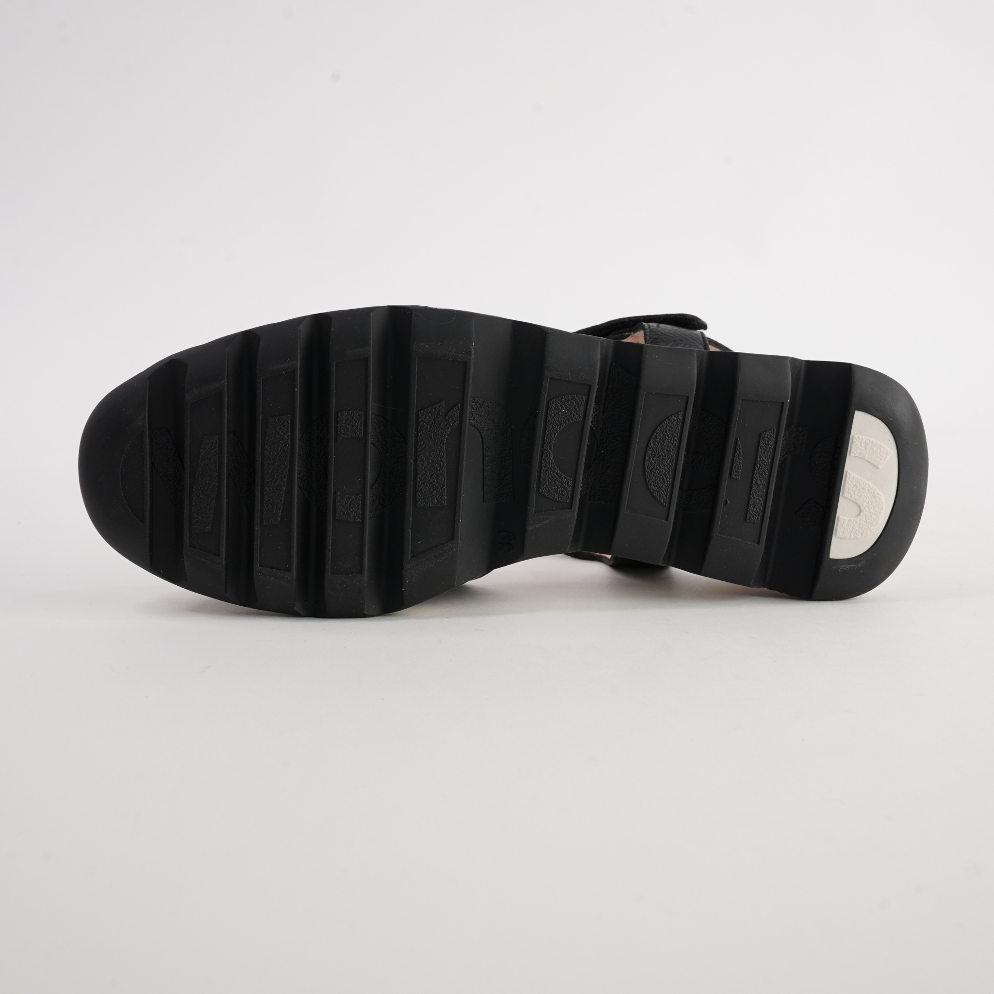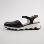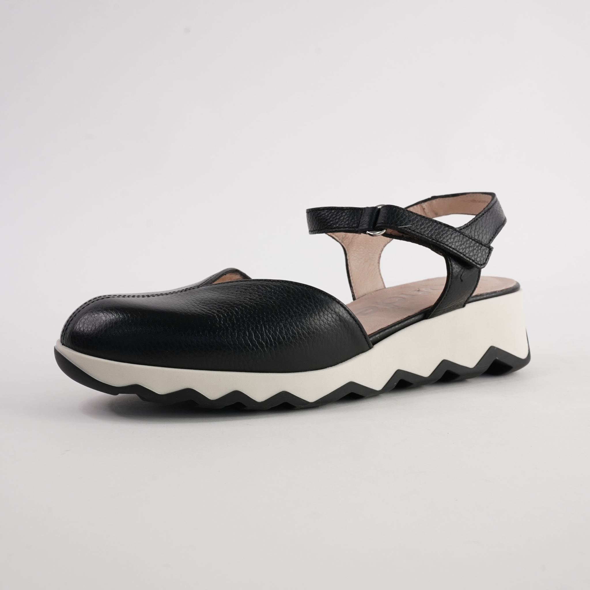 The Cobi Black Leather Wedges by Wonders combine modern minimalism with everyday ease. Expertly crafted in Spain from soft pebbled leather, this closed-toe wedge features a secure ankle strap and the brand’s signature lightweight WondersFly™ sole. With its contrasting black-and-white platform and cushioned insole, Cobi offers stylish height and all-day comfort in one sleek design.