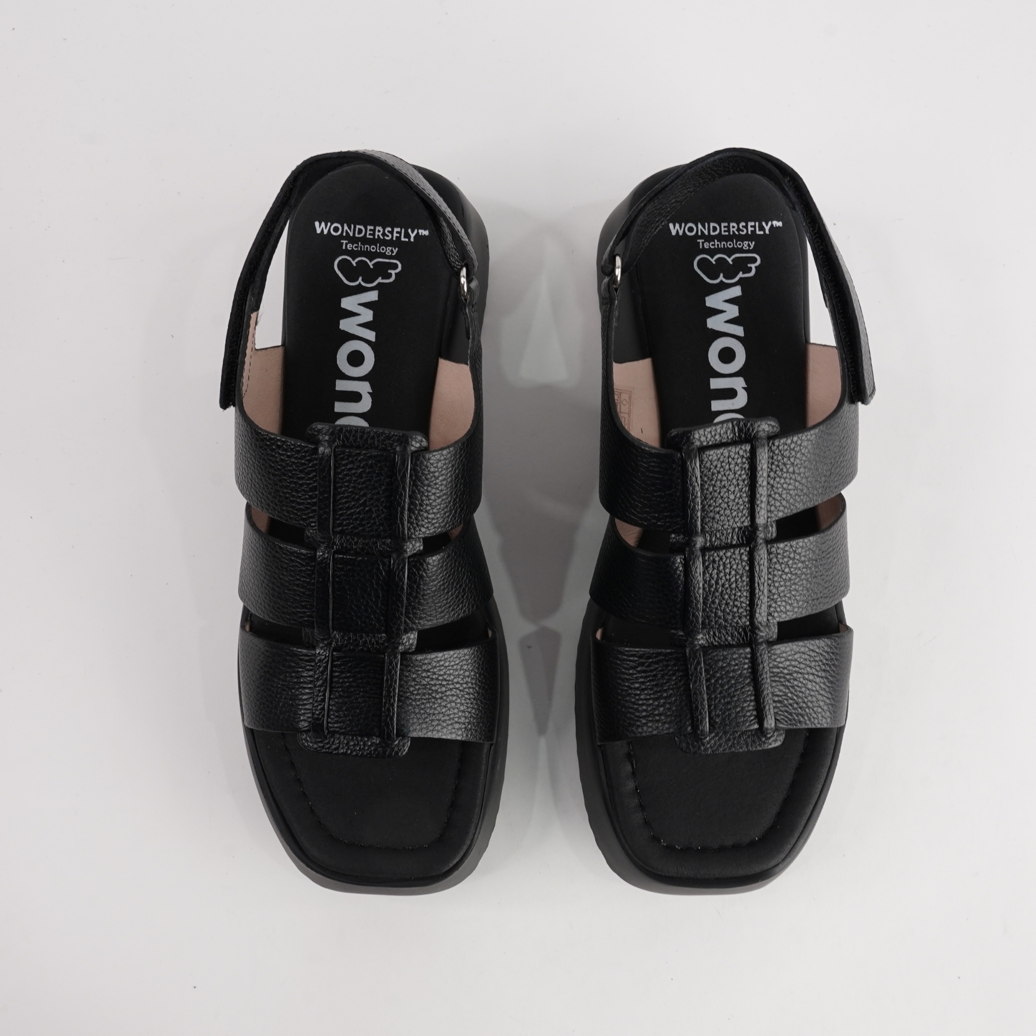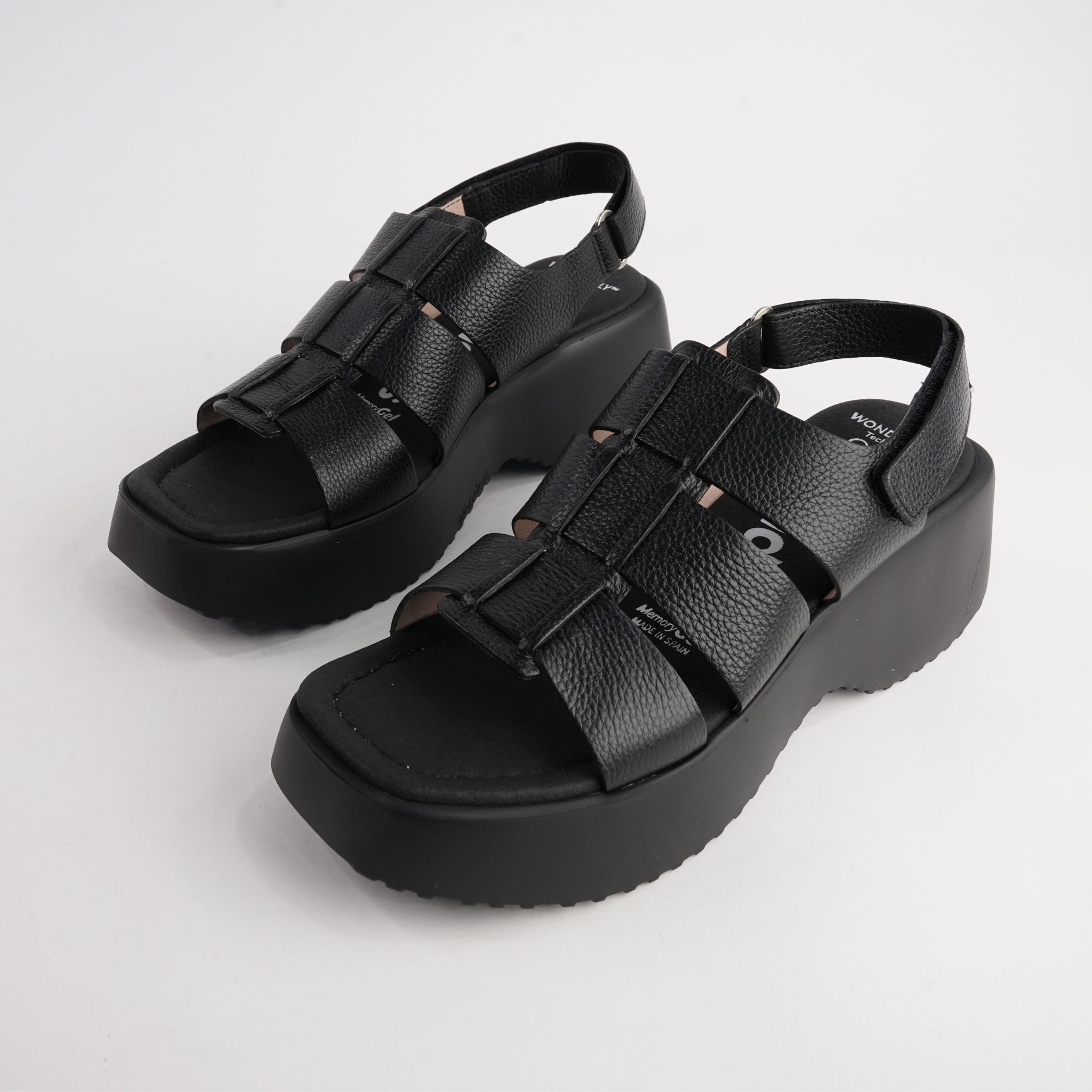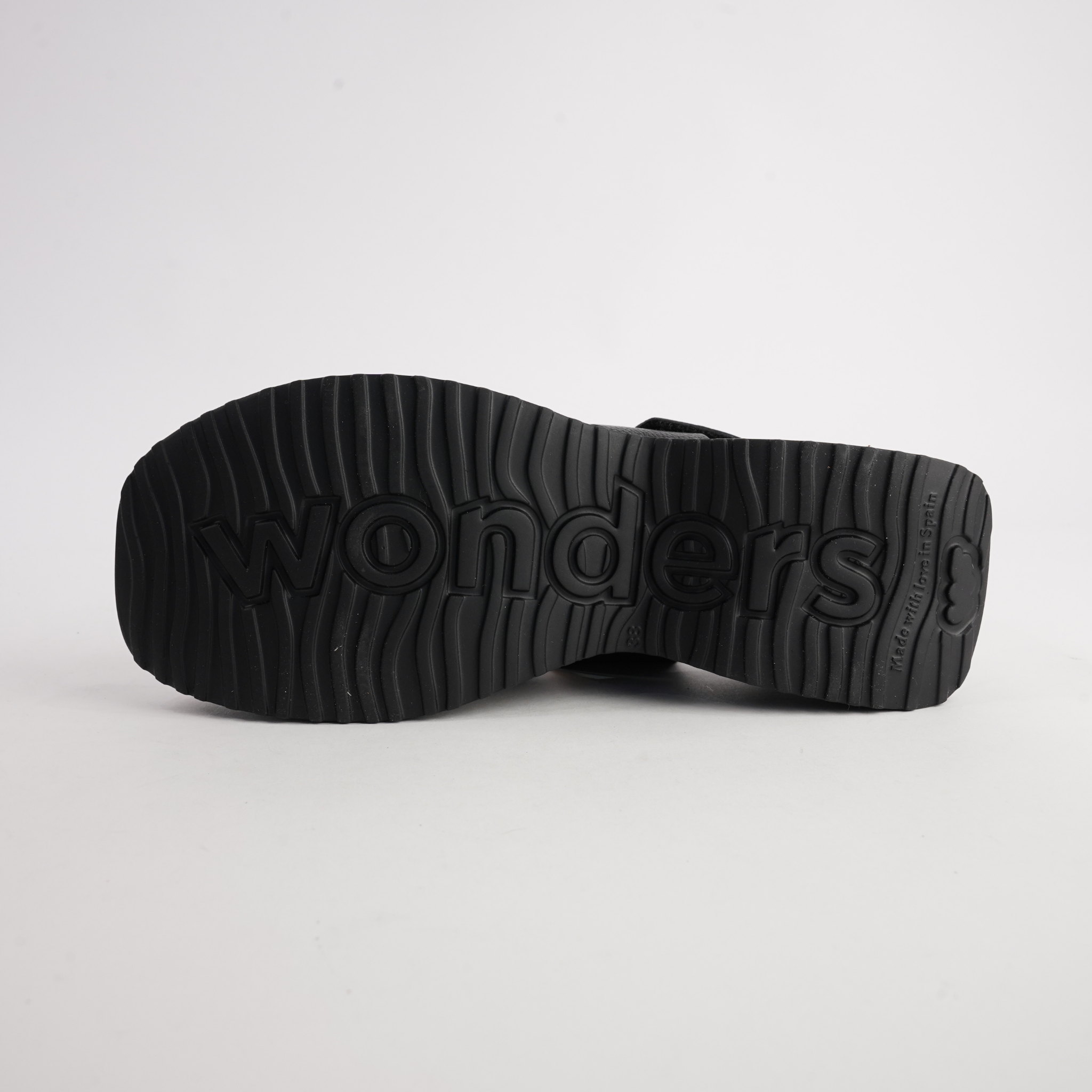 Add a modern edge to your summer wardrobe with the Dove Black/ Black Sole Leather Sandals by Wonders. Featuring a bold platform sole and black leather straps, these sandals perfectly combine contemporary style with effortless comfort. The soft leather upper and cushioned footbed provide a luxurious feel, while the adjustable strap ensures a secure, personalised fit. A lightweight off-white sole adds height without compromising on comfort — ideal for all-day wear.