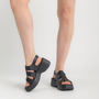 Add a modern edge to your summer wardrobe with the Dove Black/ Black Sole Leather Sandals by Wonders. Featuring a bold platform sole and black leather straps, these sandals perfectly combine contemporary style with effortless comfort. The soft leather upper and cushioned footbed provide a luxurious feel, while the adjustable strap ensures a secure, personalised fit. A lightweight off-white sole adds height without compromising on comfort — ideal for all-day wear.