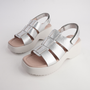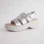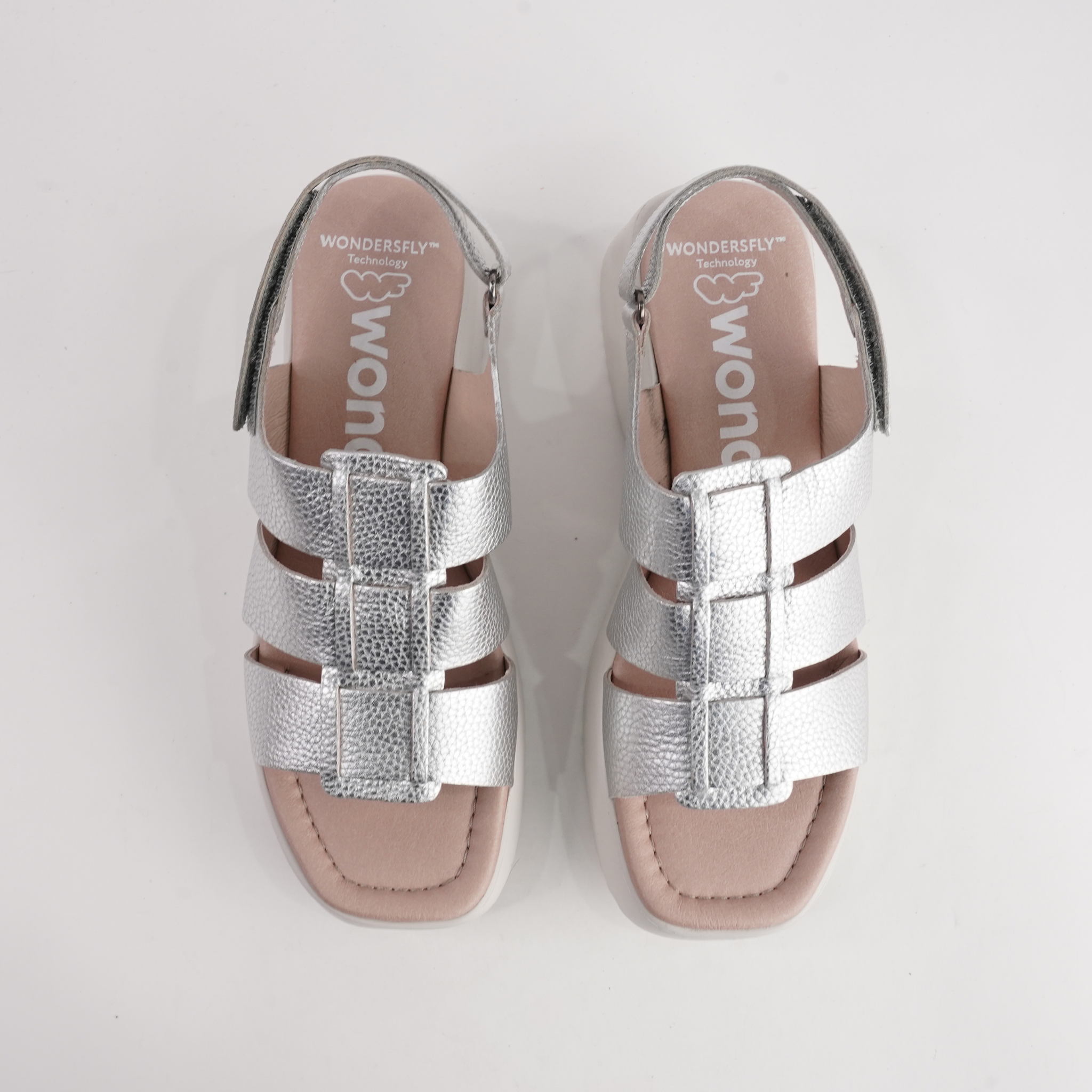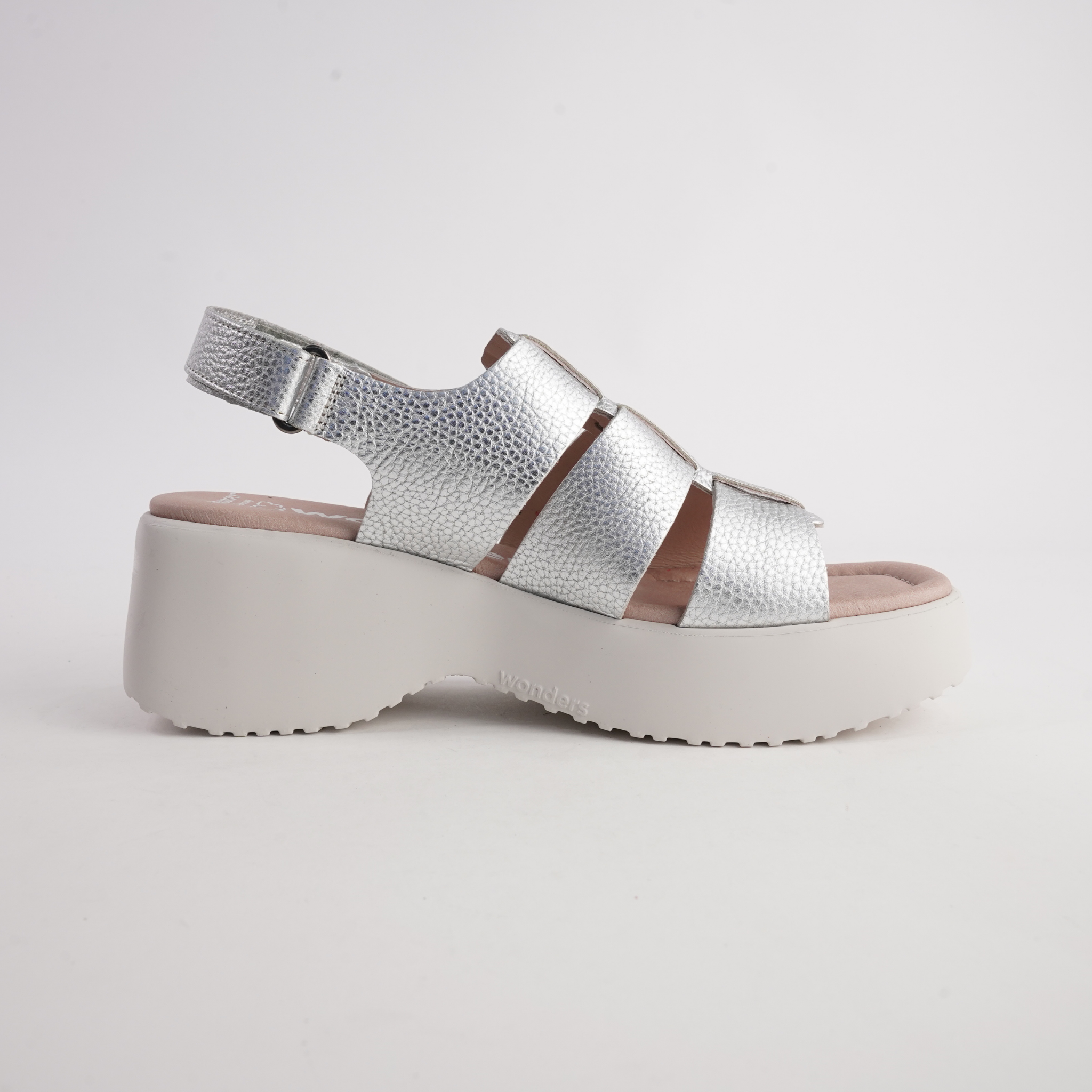 Add a modern edge to your summer wardrobe with the Dove Silver/Off White Leather Sandals by Wonders. Featuring a bold platform sole and metallic silver leather straps, these sandals perfectly combine contemporary style with effortless comfort. The soft leather upper and cushioned footbed provide a luxurious feel, while the adjustable strap ensures a secure, personalised fit. A lightweight off-white sole adds height without compromising on comfort — ideal for all-day wear.