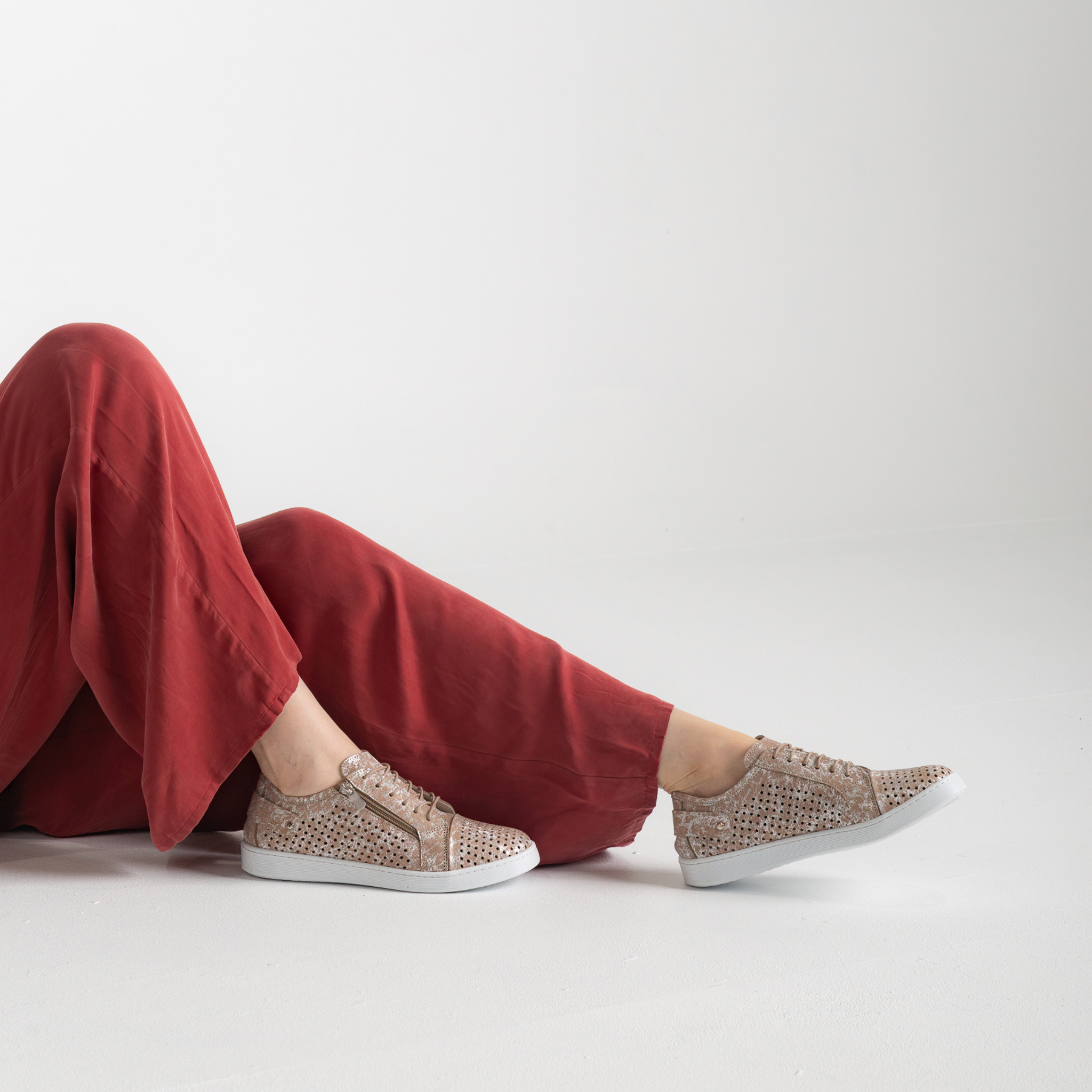 Add a touch of colour to your everyday look with the EG17P Taupe sneakers. Crafted from soft perforated leather, they offer breathability and all-day comfort. Featuring lace-up styling with a convenient side zip, these sneakers are orthotic friendly with a removable insole and set on a lightweight flexible sole.