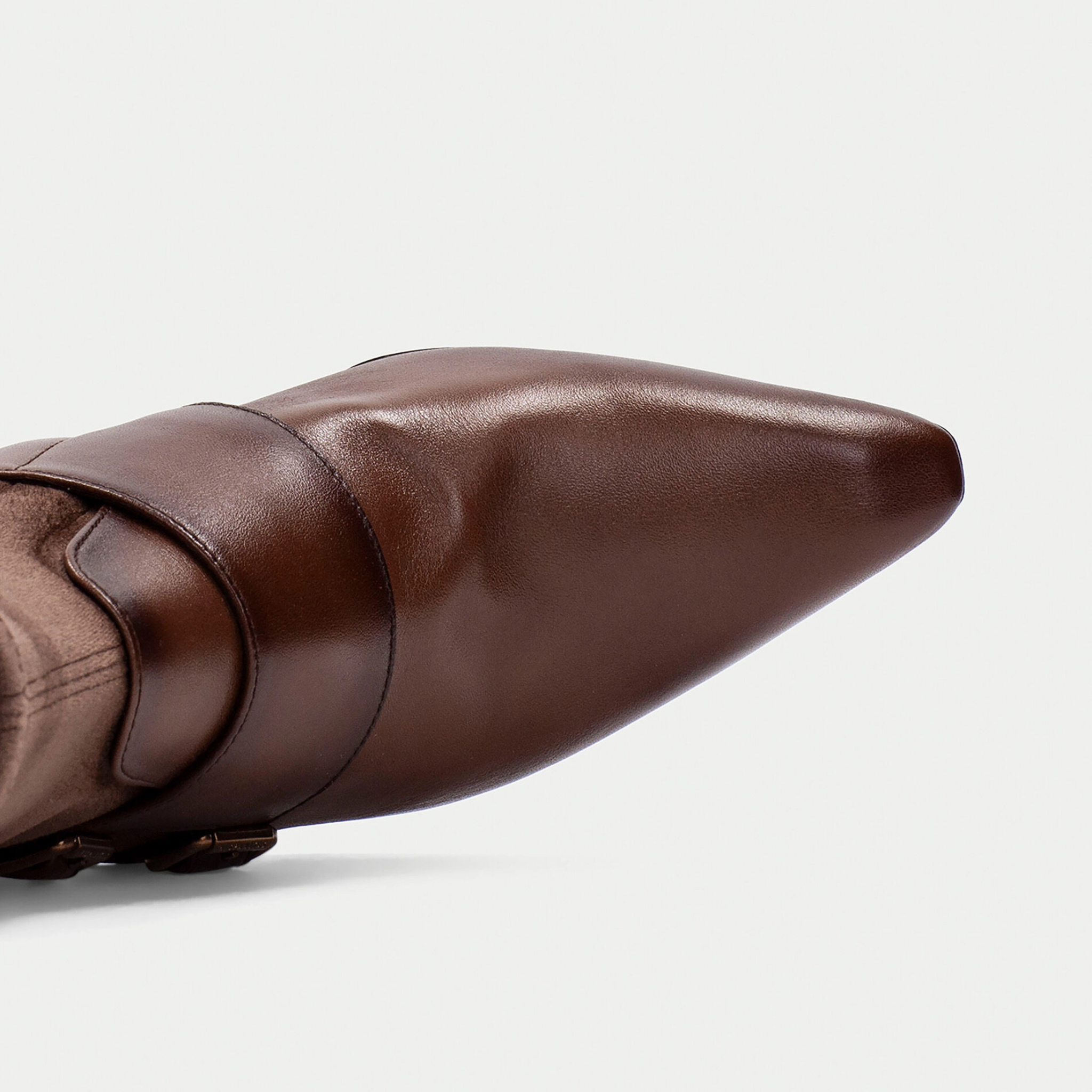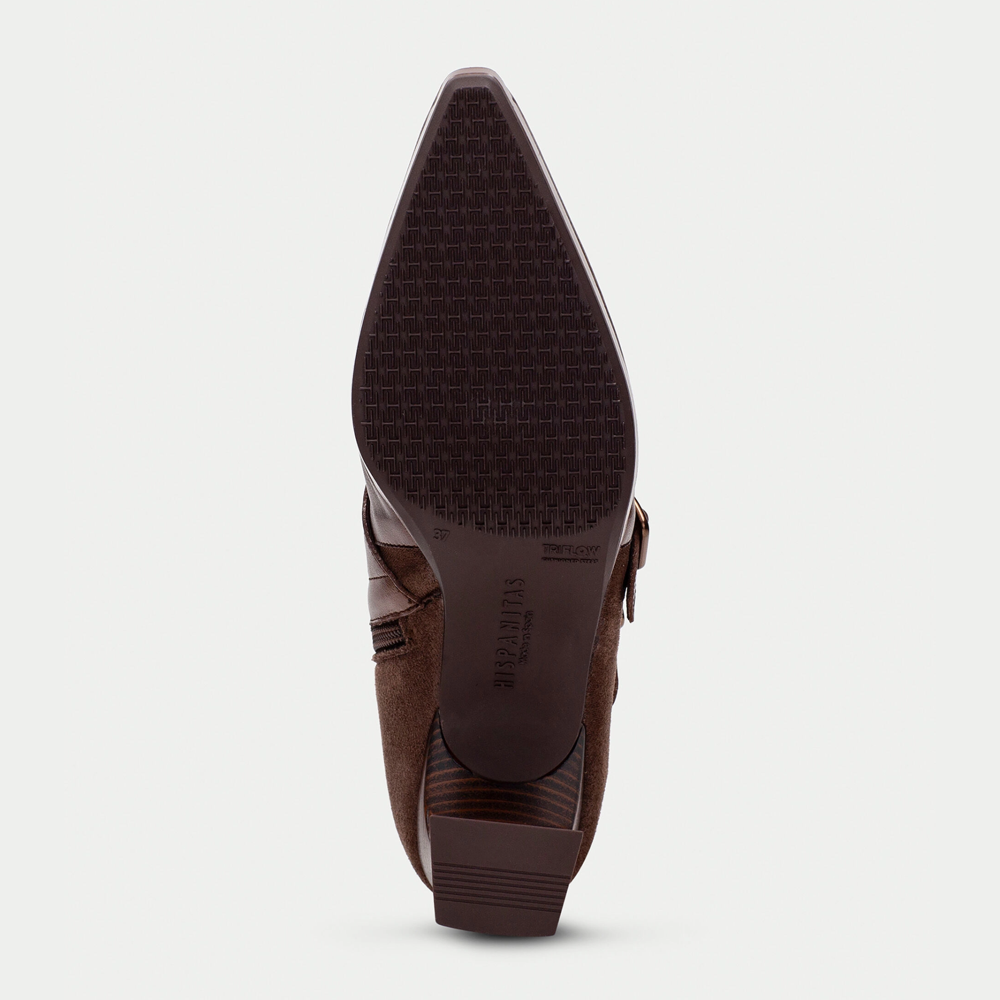 A refined monk strap ankle boot with a sharp pointed toe, designed to elevate everyday dressing. Crafted from smooth leather combined with elastic for a comfortable, flexible fit, this style sits on a lightweight 1 cm platform and a 7 cm geometric heel finished with a wood-effect detail. Inside, a non-animal-based lining is 100% breathable and thermoregulating, while Hispanitas’ signature Triflow Technology delivers triple cushioning to absorb impact and provide exceptional comfort with every step.