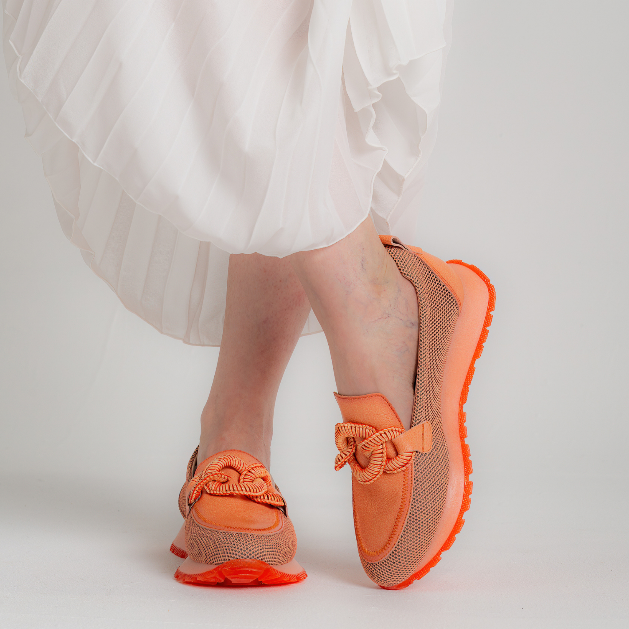 A casual sports-inspired loafer the Hv254065 by Hispanitas are crafted in tangerine leather with mesh fabric and a hand-made thread chain detail. Featuring Triflow cushioning for impact absorption, a 3.5 cm non-slip sole, and a removable anatomical insole for all-day comfort.