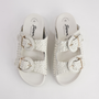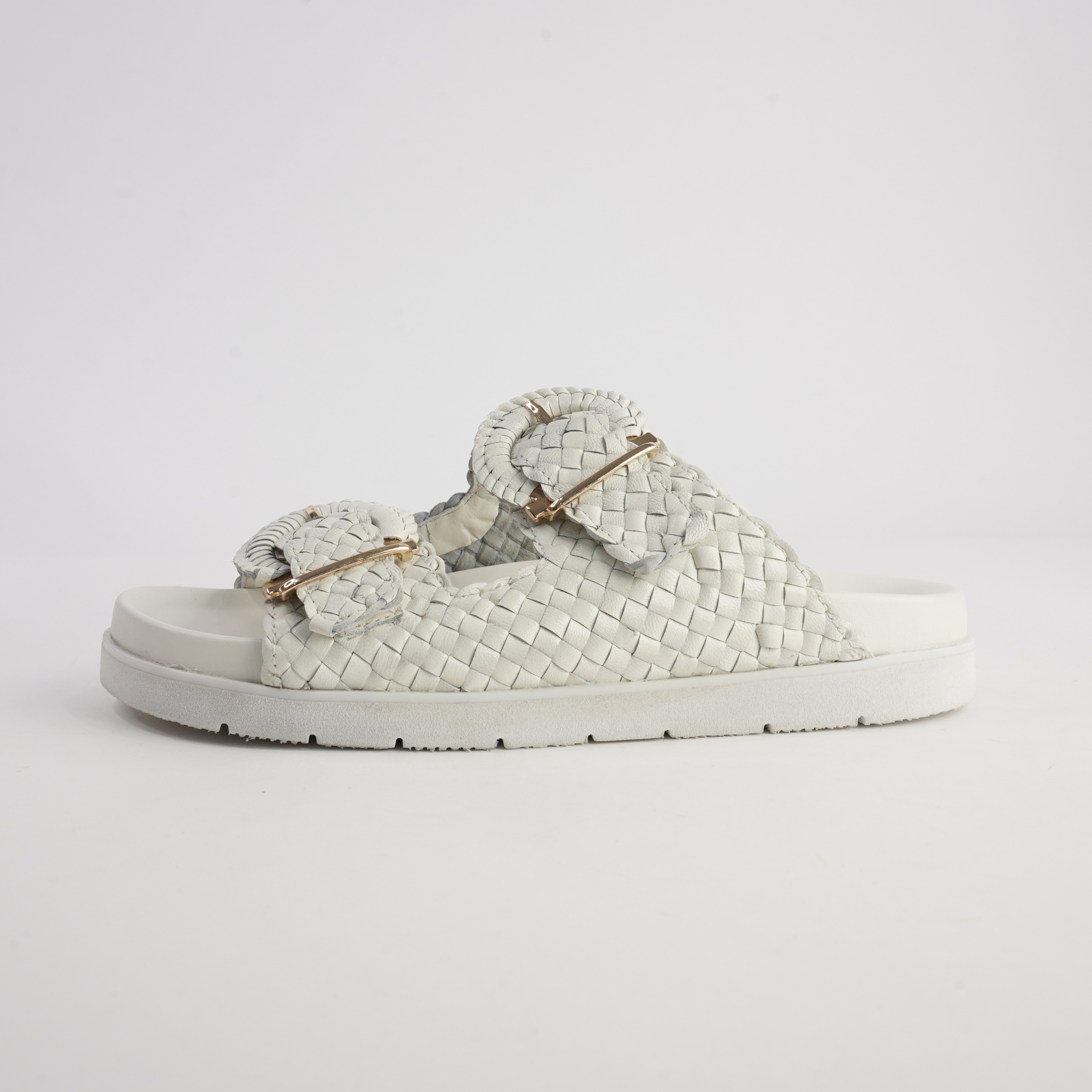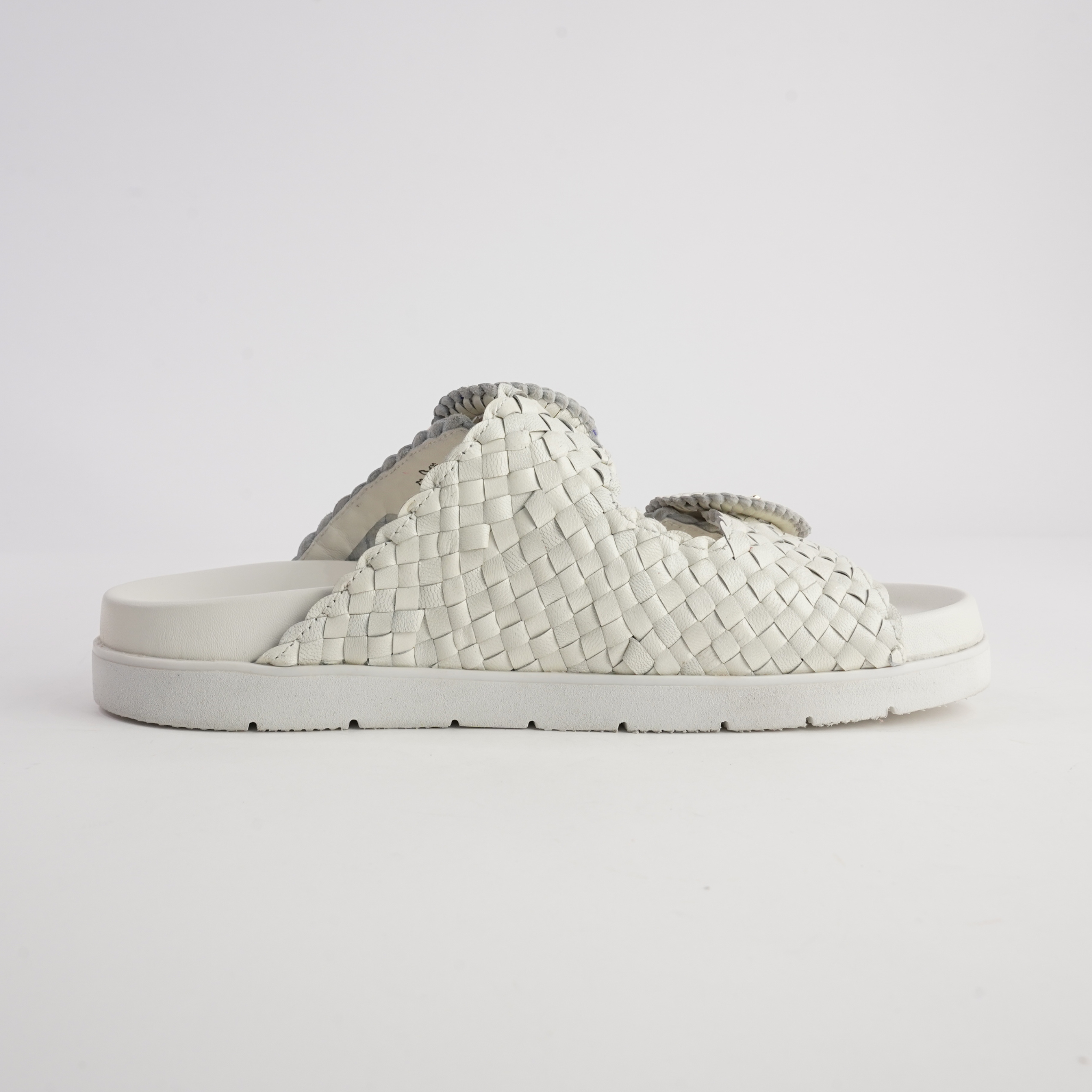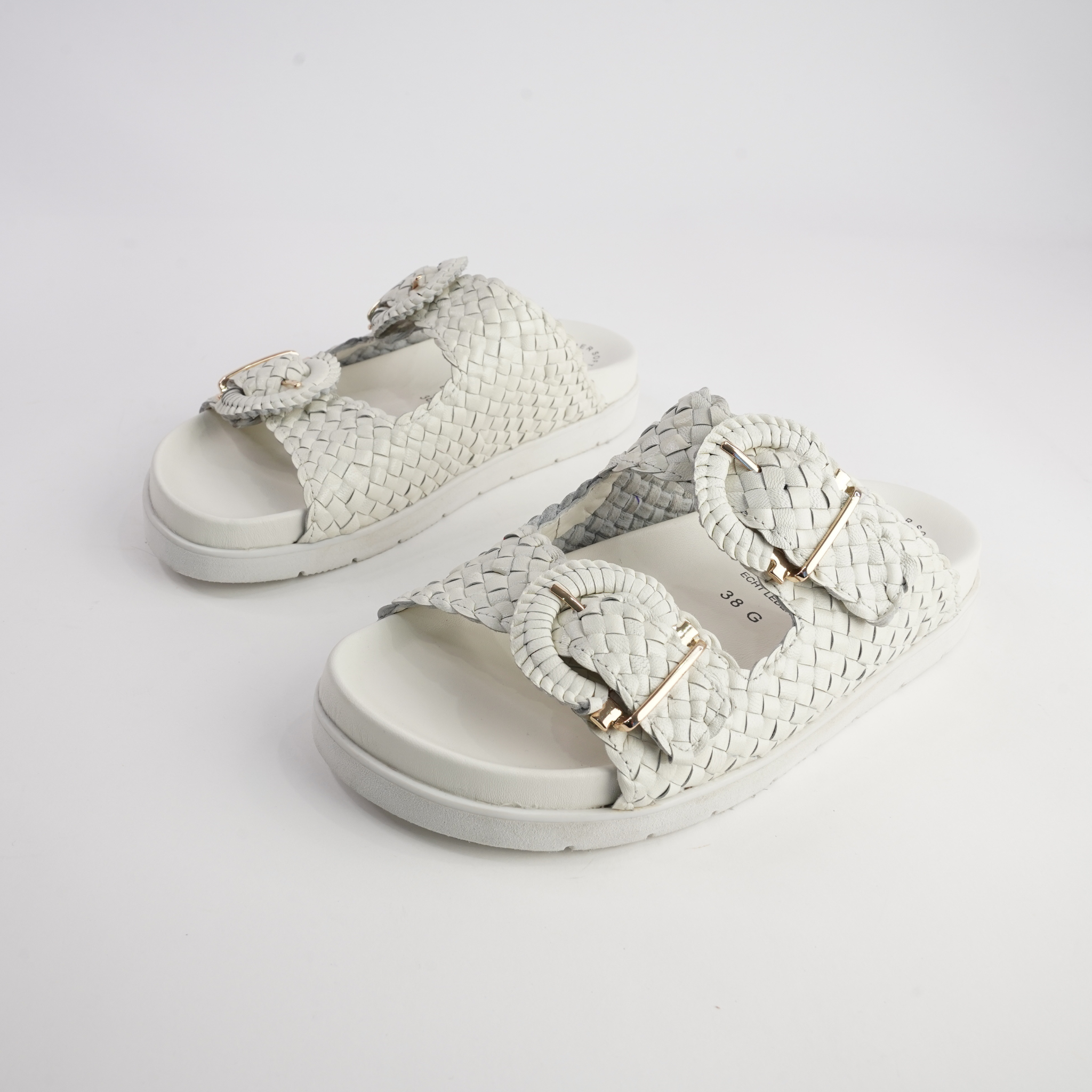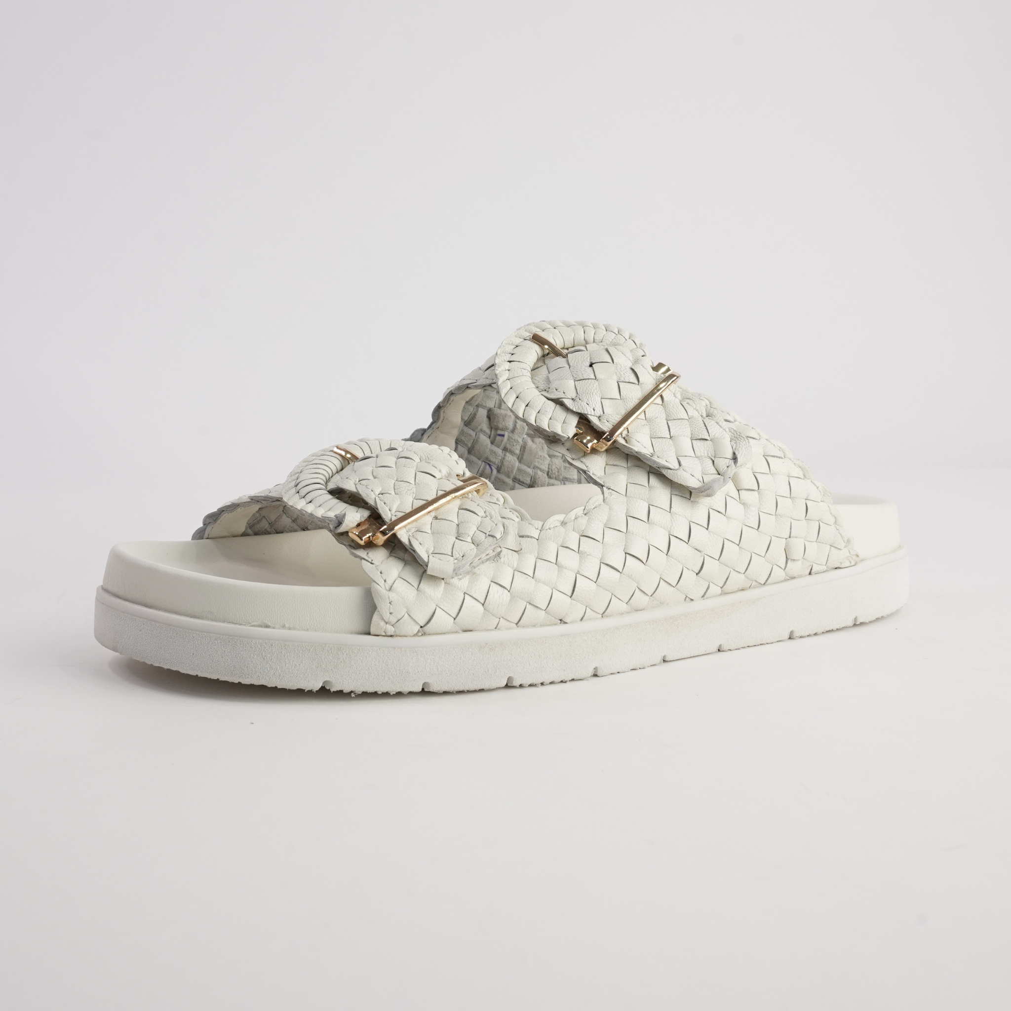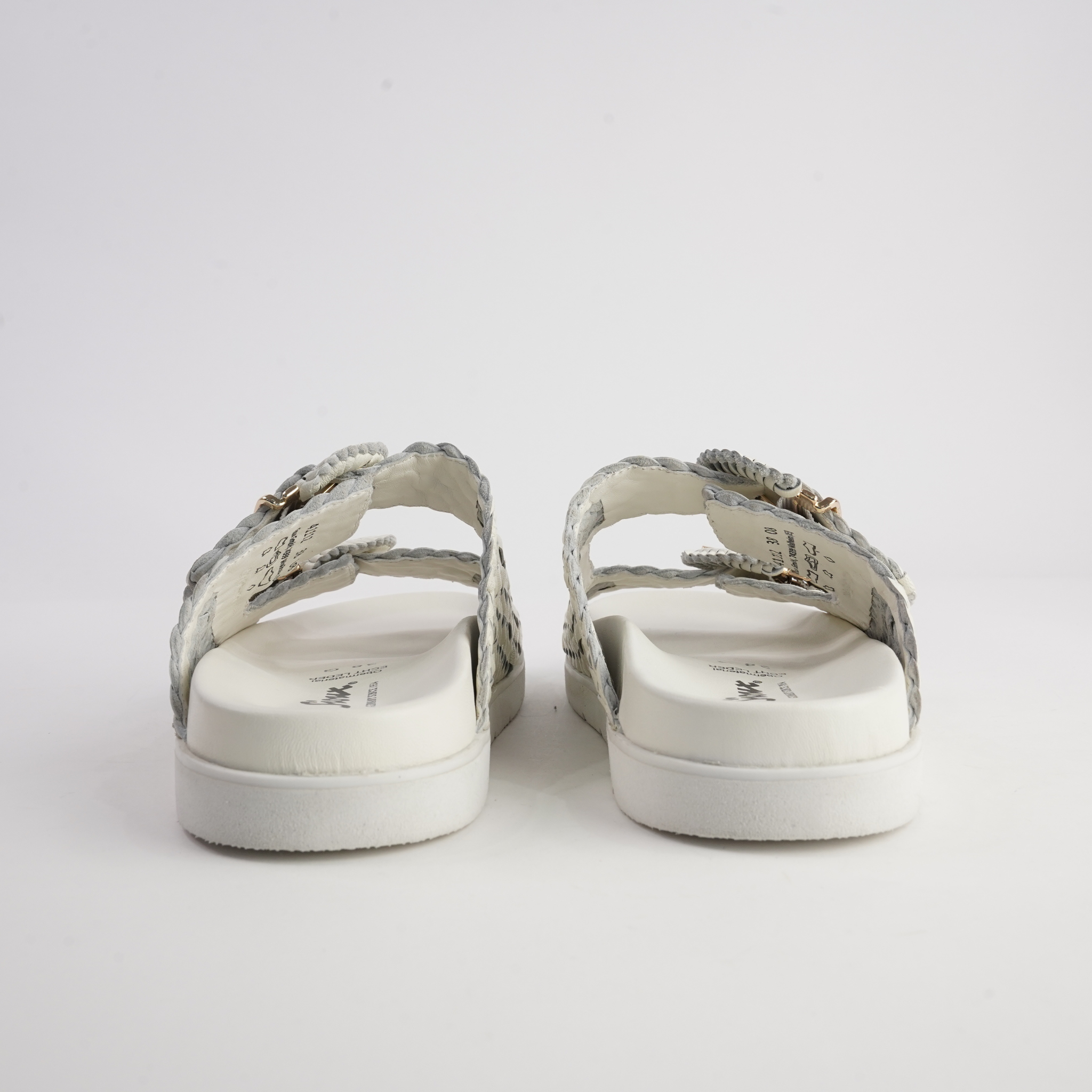 Relaxed luxury meets effortless style in the Janescha 701 Off White Slides by Sioux. Crafted in soft woven leather, these slides feature twin statement buckles in gold-tone hardware, bringing an elevated touch to an everyday classic. The cushioned footbed and lightweight sole ensure lasting comfort — perfect for pairing with linen separates or casual summer dresses.