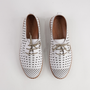 The Kroon White Leather Lace Up Flats by Cabello are the perfect blend of comfort and casual style. Handcrafted from premium soft leather with a perforated design, these lightweight lace-ups offer breathability and everyday ease. A flexible sole and cushioned insole provide lasting comfort, making them ideal for all-day wear.