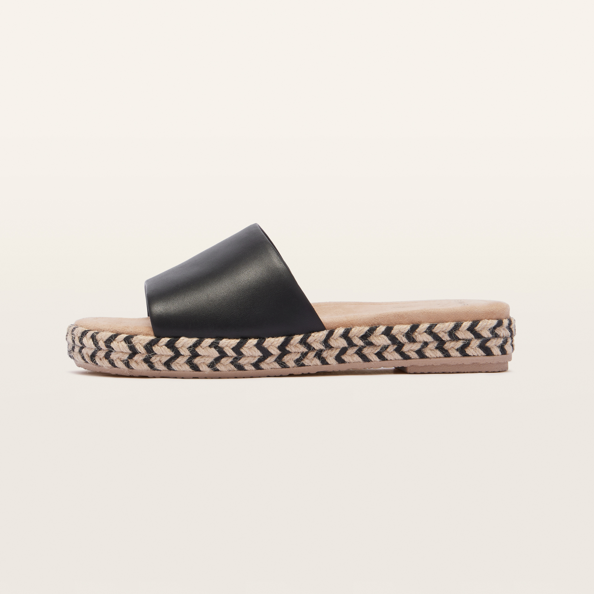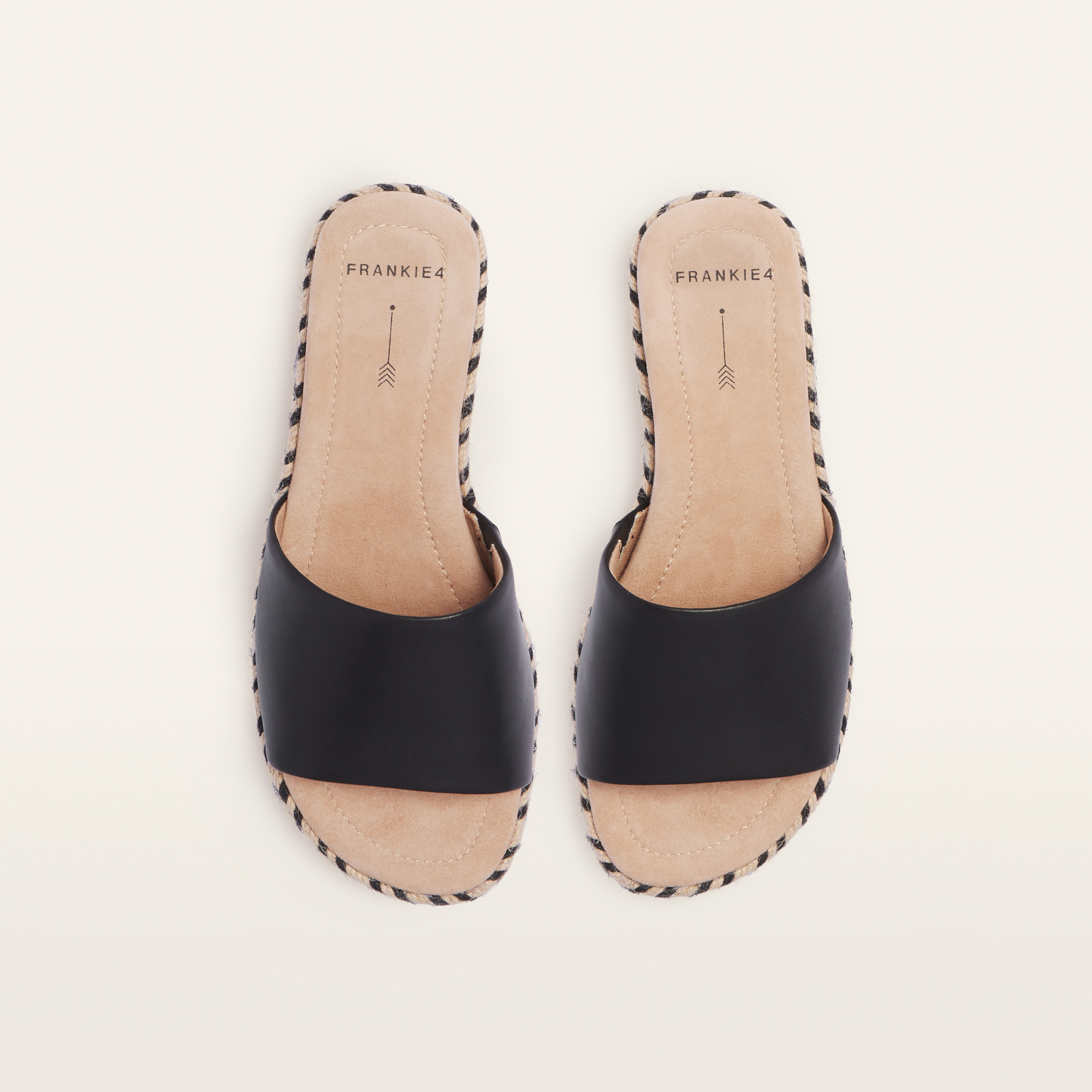 Meet the Lucia Black Leather Slides, a modern, minimalist espadrille-inspired slide designed by FRANKIE4 for all-day ease. Crafted from premium black leather with a softly contoured footbed, Lucia blends elevated simplicity with next-level comfort. The double-layered espadrille platform adds a relaxed summer feel while keeping the silhouette sleek and refined. Light underfoot and easy to style, these slides pair perfectly with everything from linen sets to flowy dresses.