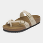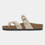 The Mayari Graceful Sandcastle Sandals bring together everyday wearability and refined elegance. With a slim toe loop, delicate crossover straps, and a soft metallic shimmer, these Birkenstocks are a stylish twist on the classic footbed sandal.
