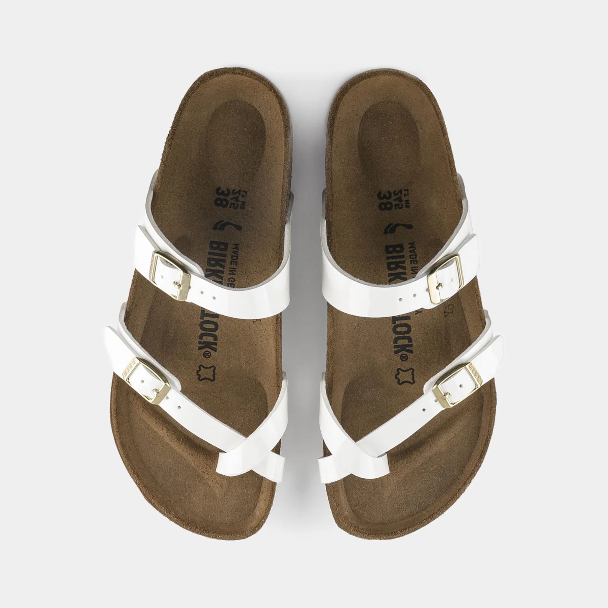The Mayari combines elegant, slim straps with Birkenstock’s signature comfort. Finished in glossy patent white, this lightweight sandal features a flattering toe loop and a contoured footbed for all-day support.