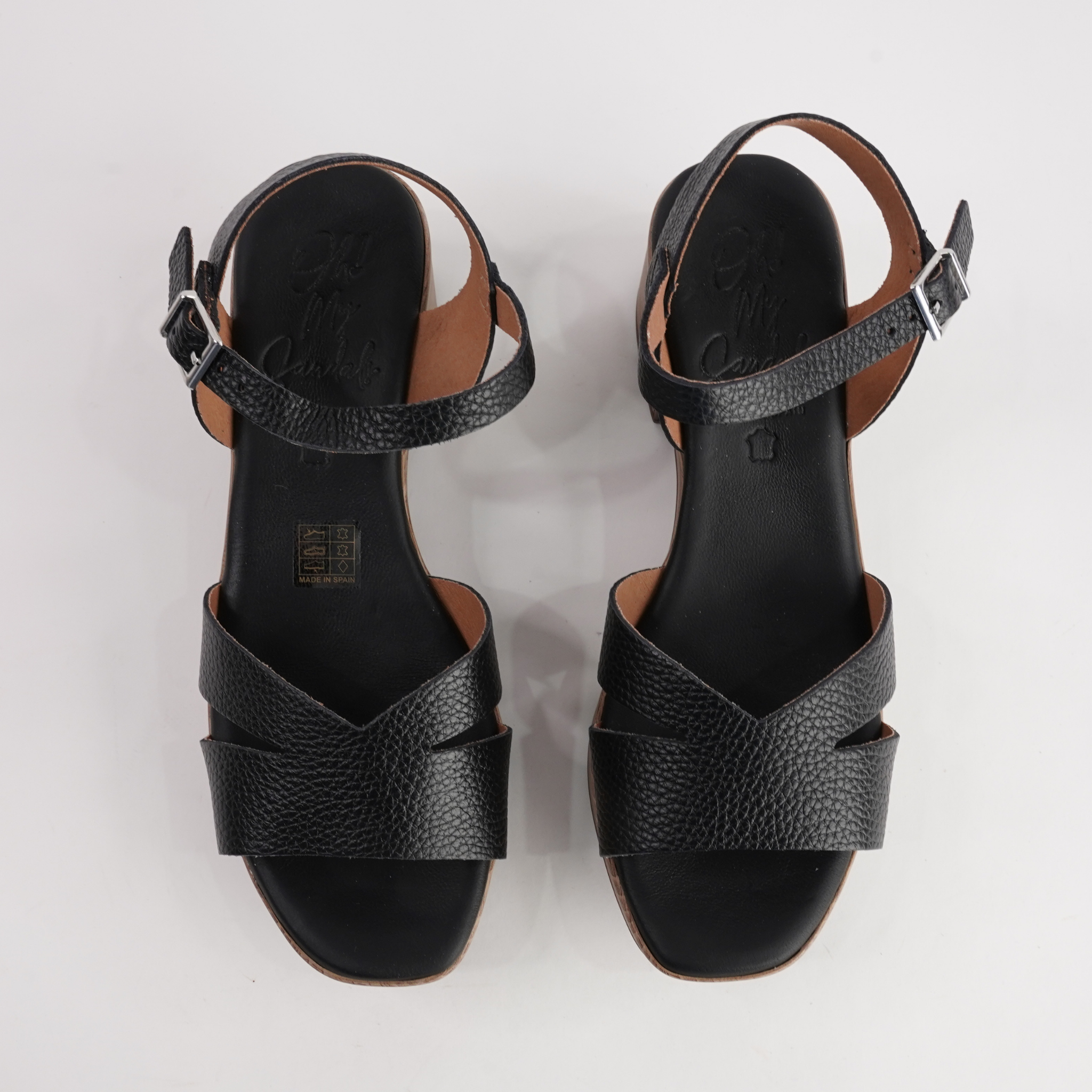 Elevate your summer style with the Phillipa Negro Leather Heels by Oh! My Sandals. Crafted in Spain from soft black leather, these block heels feature a sleek crossover front and adjustable ankle strap for a secure, feminine fit. The cushioned footbed and wood-effect platform sole deliver all-day comfort with a touch of retro-inspired charm perfect for everything from daytime events to evening outings.