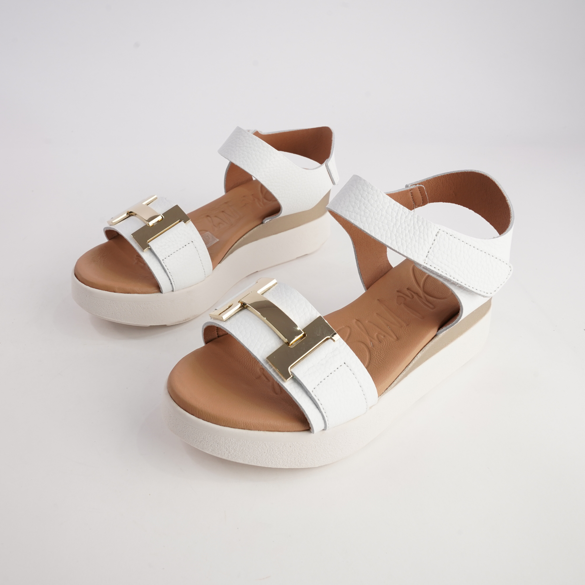 Step into summer with the Saul Blanco Leather Sandals by Oh! My Sandals. Made in Spain from premium white leather, these sandals feature a chic gold-tone buckle accent and a modern platform sole for elevated everyday comfort. The soft cushioned footbed and adjustable velcro straps provide a secure fit, while the lightweight sole ensures effortless wear from day to night.