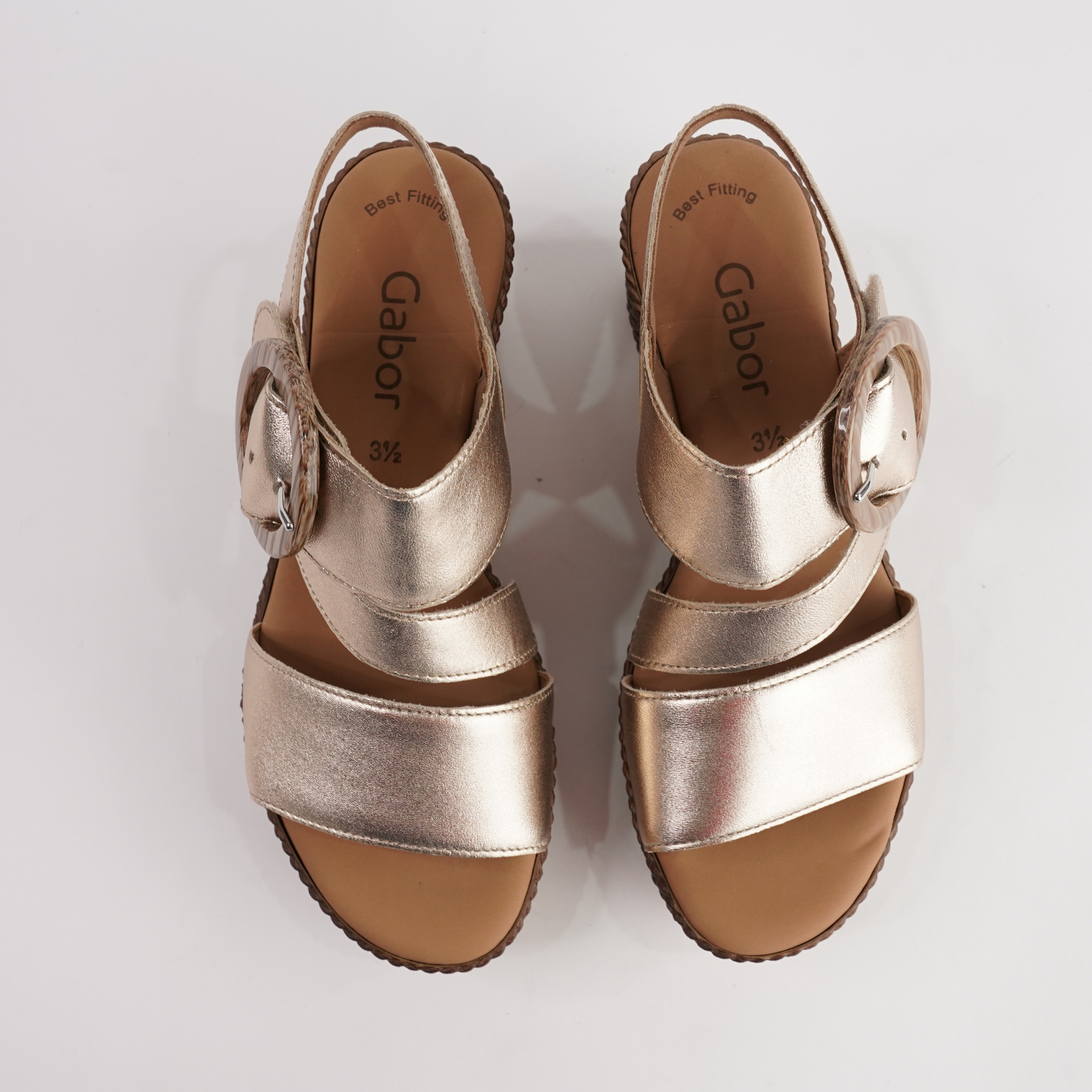 The Thelma Champagne Wedges by Gabor are the perfect blend of elegance and comfort. Crafted in soft leather, these sandals feature wide crossover straps and a bold round buckle detail that adds a touch of sophistication. The woven-effect wedge heel gives natural texture and lift, while the cushioned footbed ensures lasting comfort for all-day wear.