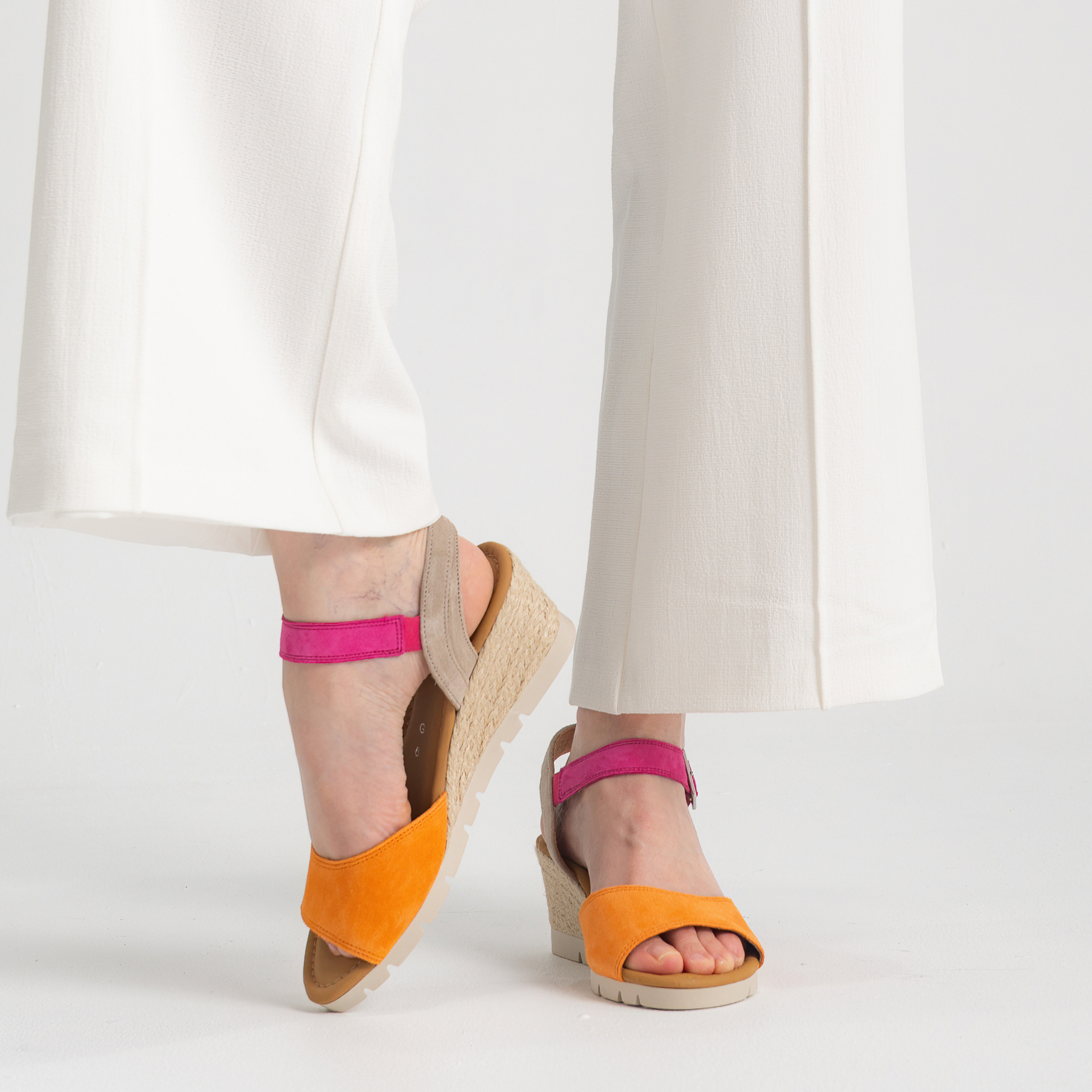 The Winifred Mandarin/ Pink Leather Sandals by Gabor bring together timeless elegance and everyday comfort. Designed with a subtle suede finish, these wedges feature a supportive cushioned footbed and a woven-effect wedge heel for a refined summer look. The adjustable ankle strap ensures a secure fit, while the lightweight sole provides flexibility and grip for all-day wear.