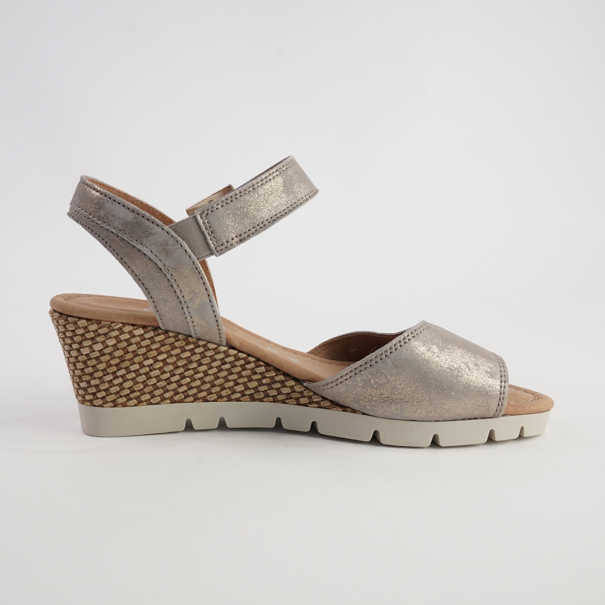 The Winifred Muschel Leather Sandals by Gabor bring together timeless elegance and everyday comfort. Designed with a subtle metallic finish, these wedges feature a supportive cushioned footbed and a woven-effect wedge heel for a refined summer look. The adjustable ankle strap ensures a secure fit, while the lightweight sole provides flexibility and grip for all-day wear.